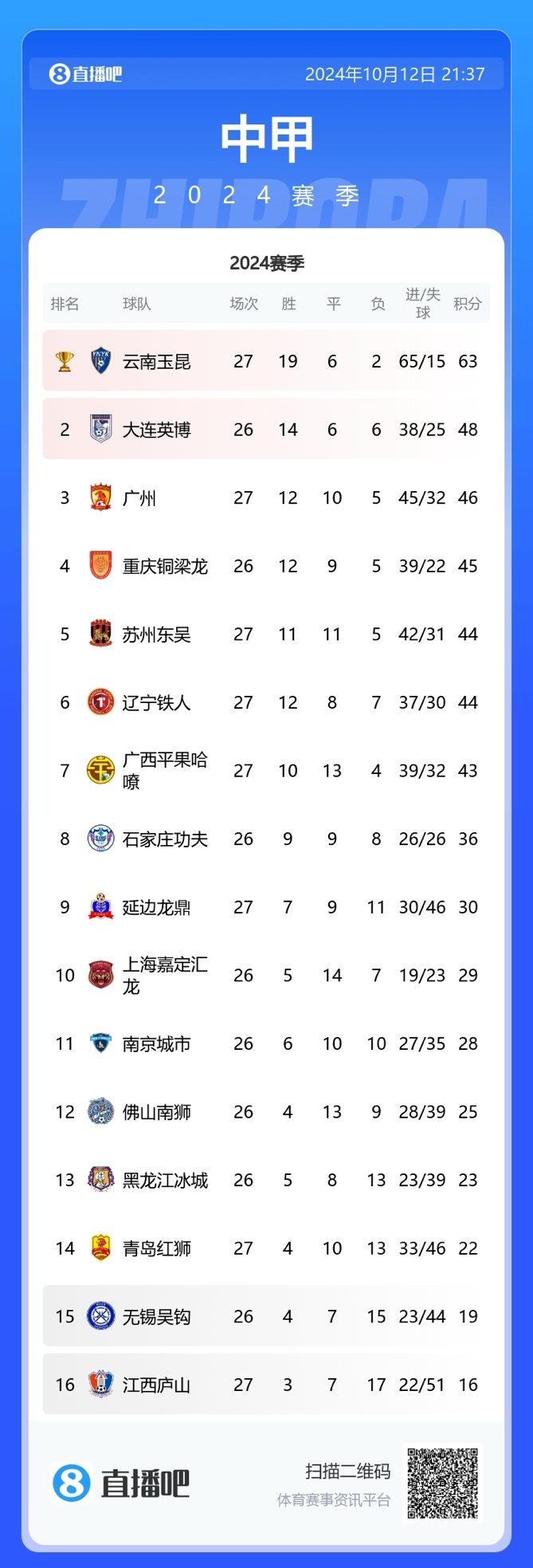 10月12日讯 今天中甲联赛进行了第27轮4场比赛,其中云南玉昆主场击败苏州东吴,提前三轮夺得冠军;辽宁铁人客场击败青岛红狮,李金羽上任后12场不败,积分距离第三的广州队仅有2分。