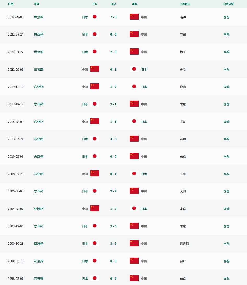据统计,中国男足上一次击败日本是在1998年的戴拿斯杯四强赛中,当时国足2-0击败日本。此后国足各项赛事至今已15场不胜日本,期间总战绩为15战9负6平。