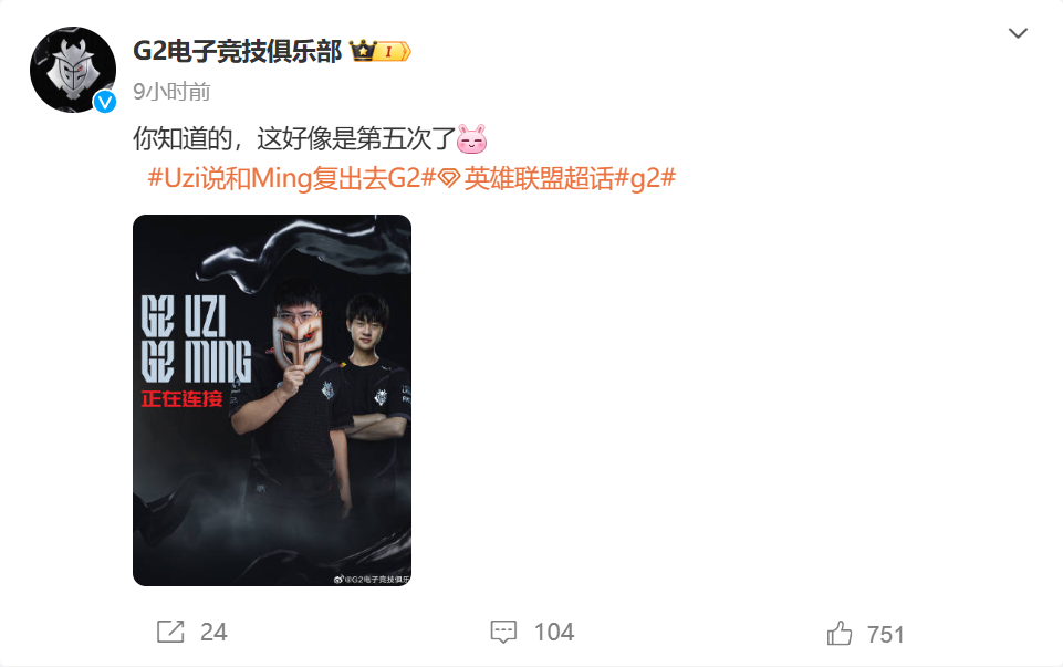 雷速体育11月30日讯 G2电子竞技俱乐部官推今日再度整活,社媒发布海报“G2 UZI,G2 Ming,正在连接”,并配文“你知道的,这好像是第五次了。”