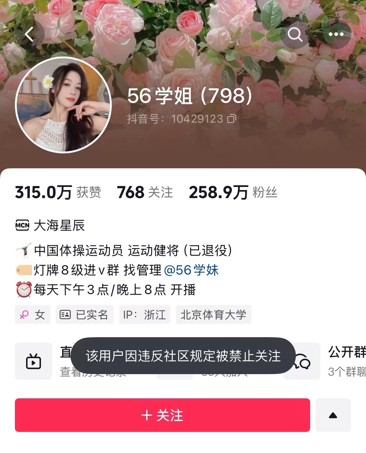 11月24日吴柳芳抖音账号无法被关注,系统提示该用户违反社区规定↓